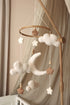 A delightfully sweet baby cradle mobile, handmade in Belgium with care and love, with dreamy soft teddy fabric clouds and beautiful stars surrounding the crescent moon. The mobile has many beautiful details for baby to marvel at, but it is still elegantly simple. Absolutely lovely to hang above a crib or even a diaper changing mat. The harmonious and neutral tones of the mobile are suitable for a variety of interiors and it is also a truly beautiful interior design element in a child's room. It also goes great with our All Teddy sleep nest and other teddy products.