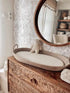 Handmade in Holland, this incredibly soft and beautiful cream-colored teddy fabric changing mat cover is available in two different sizes and shapes for either a basket-style or regular changing mat. An easy and quick way to spruce up your changing mat and make it a little cuter and softer. The cover is machine washable and dries quickly.