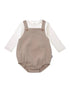 A cute unisex set with a stylish beige-toned suspender romper made of high-quality waffle fabric with crossed suspenders on the back and a white long-sleeved blouse made of soft cotton. A very versatile set that works great on its own or when combined with other clothes. The romper is perfect for summer use on its own and with socks or leggings or, for example, the super beautiful Cable Knit sweater from the same brand, it is also perfect for cooler weather. The suspenders are attached with a strap at the back so that they do not fall off the shoulders. The classic color combination of beige and white makes this outfit both stylish and trendy at the same time and the most important thing is that the baby is guaranteed to be comfortable in this outfit.
